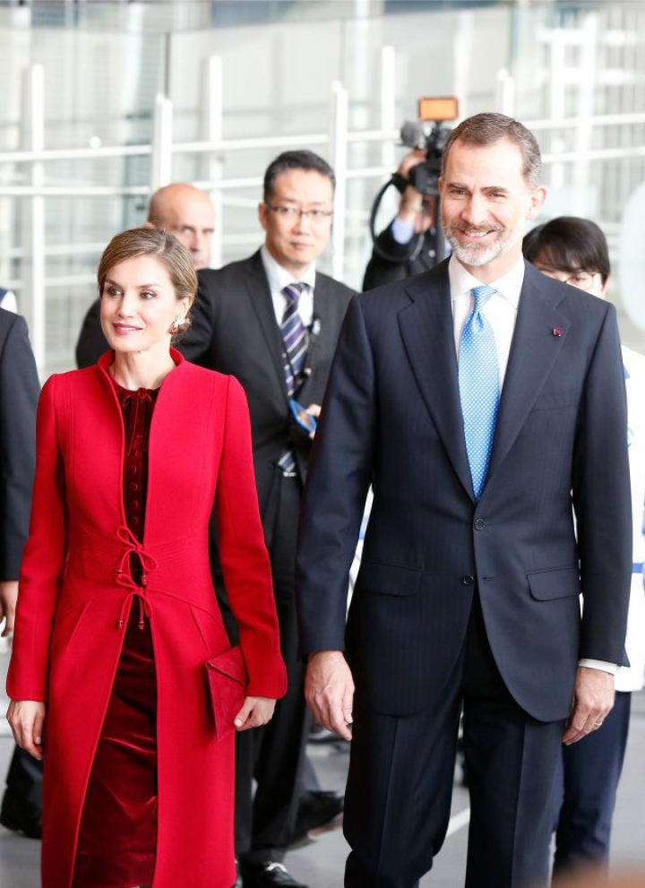 La reina lució el mismo conjunto durante la visita de Estado a Japón, más concretamente para la visita al Museo Nacional de Ciencia Emergente e Innovación. Para aquella ocasión también optó por recogido bajo, aunque dio más protagonismo a las joyas gracias a unos vistosos pendientes.