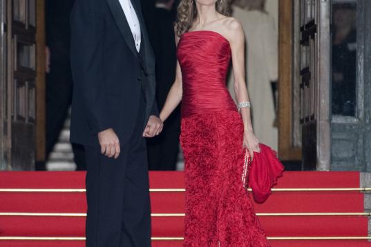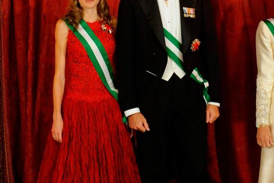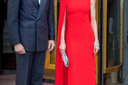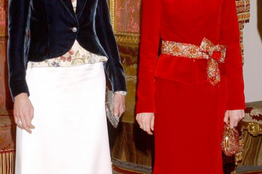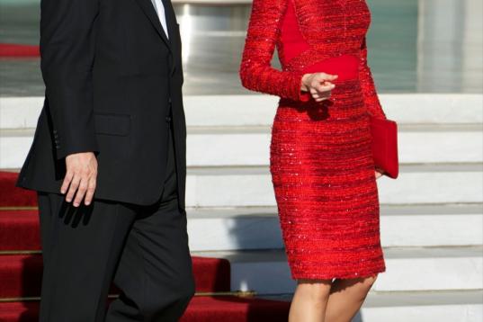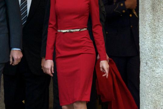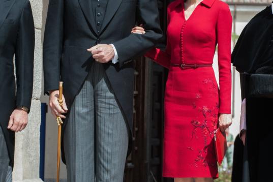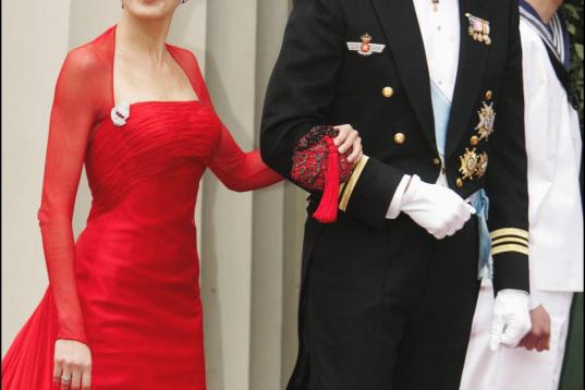 El rojo ha estado presente en el vestidor de la reina desde antes de que fuera Princesa de Asturias. Lo eligió para uno de sus primeros actos con el resto de miembros de la realeza europea, la boda de Federico y Mary de Dinamarca. Letizia lució un diseño de Lorenzo Caprile que a día de hoy todavía se recuerda.