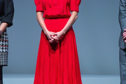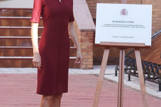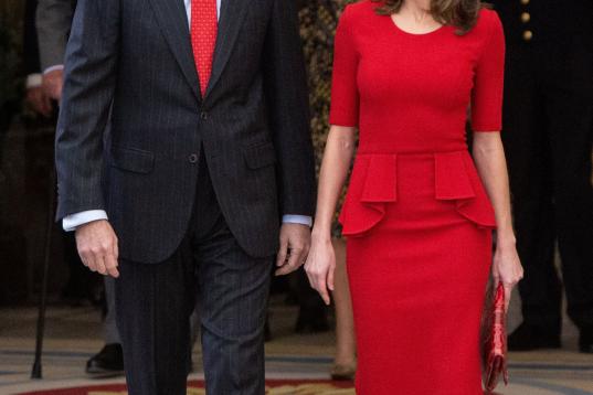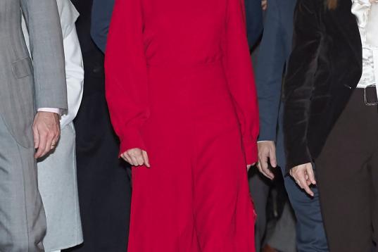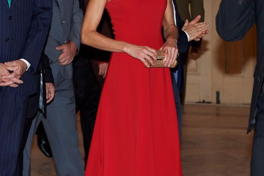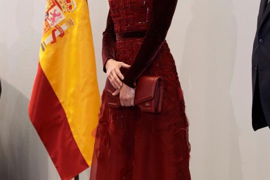 Para el acto la reina eligió un vestido rojo de raso y falda drapeada de Massimo Dutti de la temporada de invierno 2018/2019, que rondaba los 200 euros. Lo combinó con salones destalonados de Carolina Herrera también en rojo, y un clutch a juego.