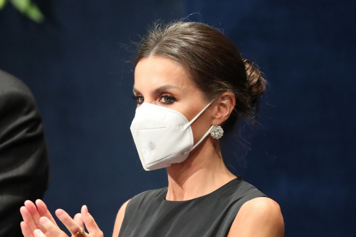En cuanto al maquillaje, la obligación de la mascarilla ha hecho que la reina centre todos sus esfuerzos en la mirada, con un efecto ahumado y una sombra en tonos metalizados.