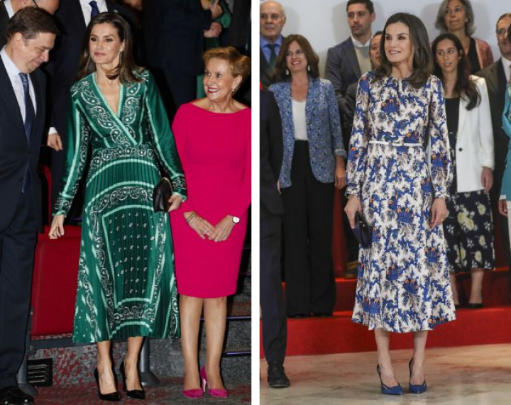 Letizia no ha tirado solo de Puig para mejorar su armario. La reina también firma un aplaudido idilio con dos marcas parisinas: Sandro y Maje, ambas del grupo francés SMCP. La primera llegó antes a su vestidor y es responsable de firmar modelos tan aplaudidos como el vestido verde en estampado paisley con escote en uve y largo midi que estrenó en 2018 y ha lucido en varias ocasiones. También de Sandro es el diseño flores azules lució por última vez el pasado mes de noviembre.