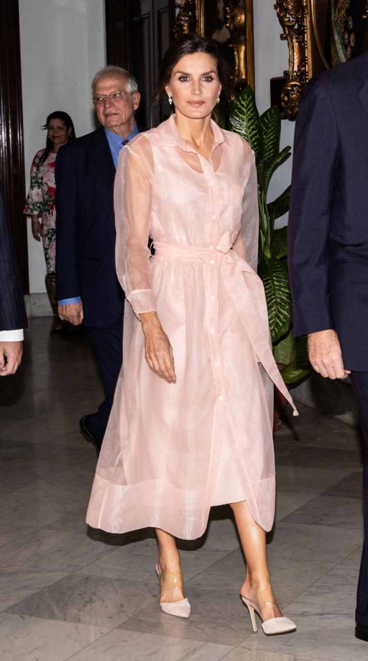 Otro de los pesos pesados de Puig es la francesa Nina Ricci, que la reina volvió a lucir durante el viaje a Cuba del pasado noviembre. Letizia estrenó un vestido plisado en color menta durante su segundo día en la isla. La marca llevaba mucho sin colarse en las apariciones de la reina, pero es responsable de dos de los diseños más conocidos de la monarca: el vestido lila que llevó con la famosa coleta burbuja, y el modelo de rayas y lentejuelas que lució en los premios Mariano de Cavia en 2016. Si se deja guiar por los aplausos que ha recibido cada vez que ha elegido a Nina Ricci, todo apunta a que repetirá.