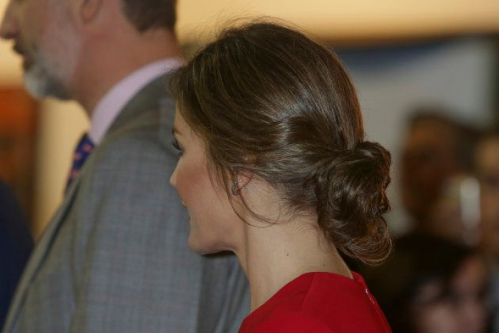 La reina ha apostado para esta jornada por un moño bajo ligeramente despeinado, que dejaba ver los pendientes daga de la firma española Gold&Roses valorados en casi 2.000 euros y que ya le vimos en la entrega del Toisón de Oro a la princesa Leonor . Para el maquillaje ha elegido un estilo bastante sofisticado, con labios a juego con el vestuario, y las uñas las ha llevado con estilo natural.