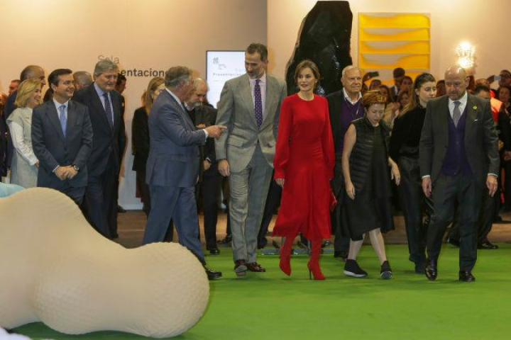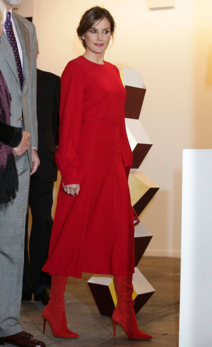 De los pies a la cabeza. La reina Letizia se ha apostado por el total red para acudir a la inauguración de ARCOmadrid2018. Con un conjunto rojo de camisa de mangas largas abullonadas y falda de talle alto por debajo de la rodilla, se ha paseado por los pasillos de Ifema junto al rey Felipe VI y una comitiva de autoridades, en la que faltaba la alcadesa de Madrid Manuela Carmena , que no ha ido en señal de protesta por la retirada de la obra Presos políticos .