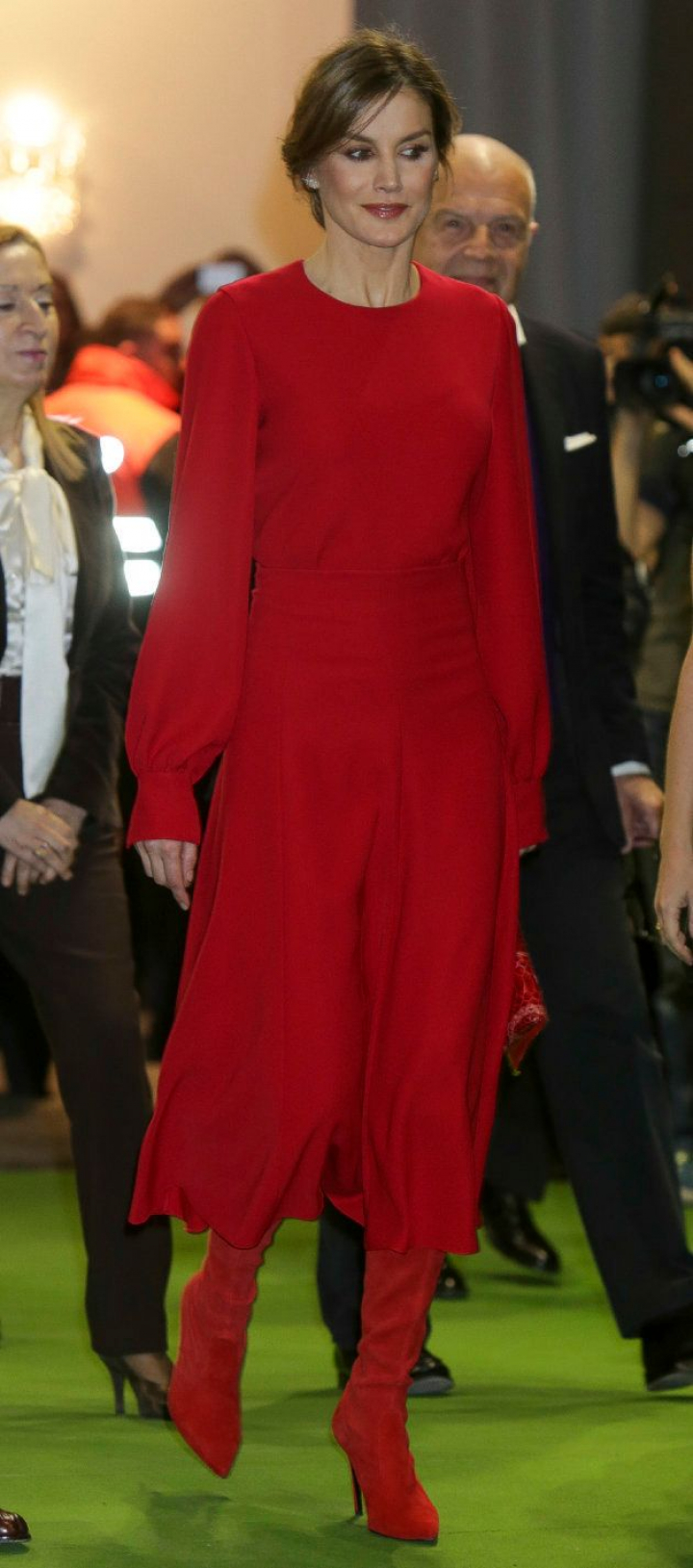 Letizia ha complementado su look con un bolso de leopardo de Carolina Herrera, también rojo, y botas altas rojas de la firma Magrit, las mismas que llevó en un acto de la Asociación Española Contra el Cáncer y que llamaron la atención de la prensa británica.