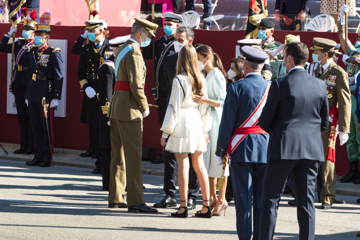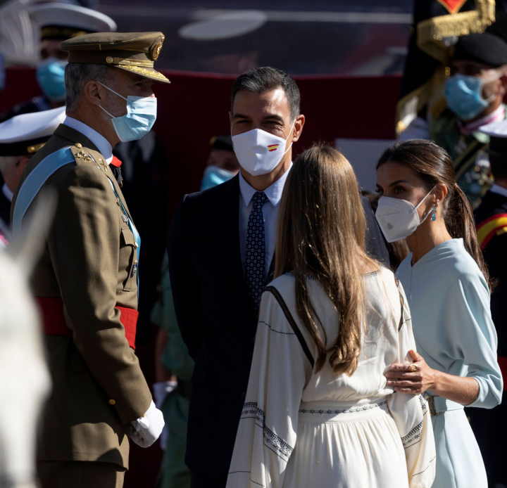 Dentro del resumen de la jornada, Point de vue comenta el estilismo de Letizia, que escogió un vestido azul celeste firmado por María Barragán y unos pendientes aguamarina que eran un guiño a Leonor. “Desde hace varios años, Letizia ha apostado por colores claros y sólidos con motivo de la fiesta nacional”, recuerda la publicación.