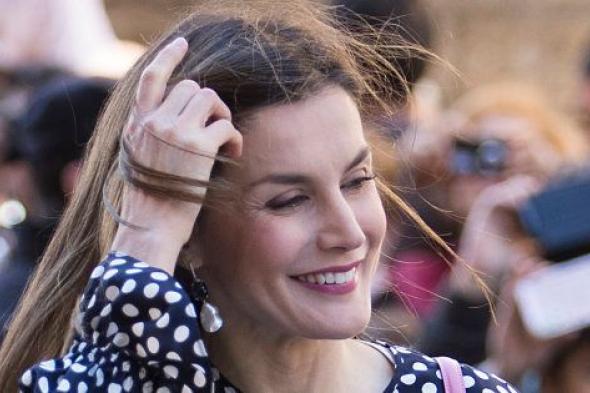 La reina ha optado en esta ocasión por una blusa de topos blancos, cuello redondo y puños con volantes, junto a un pantalón tipo palazzo, de talle alto y abotonado lateral. Ha completado el look un bolso de color rosa y unos salones de color azul oscuro.