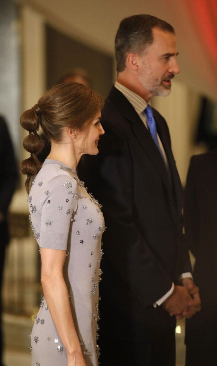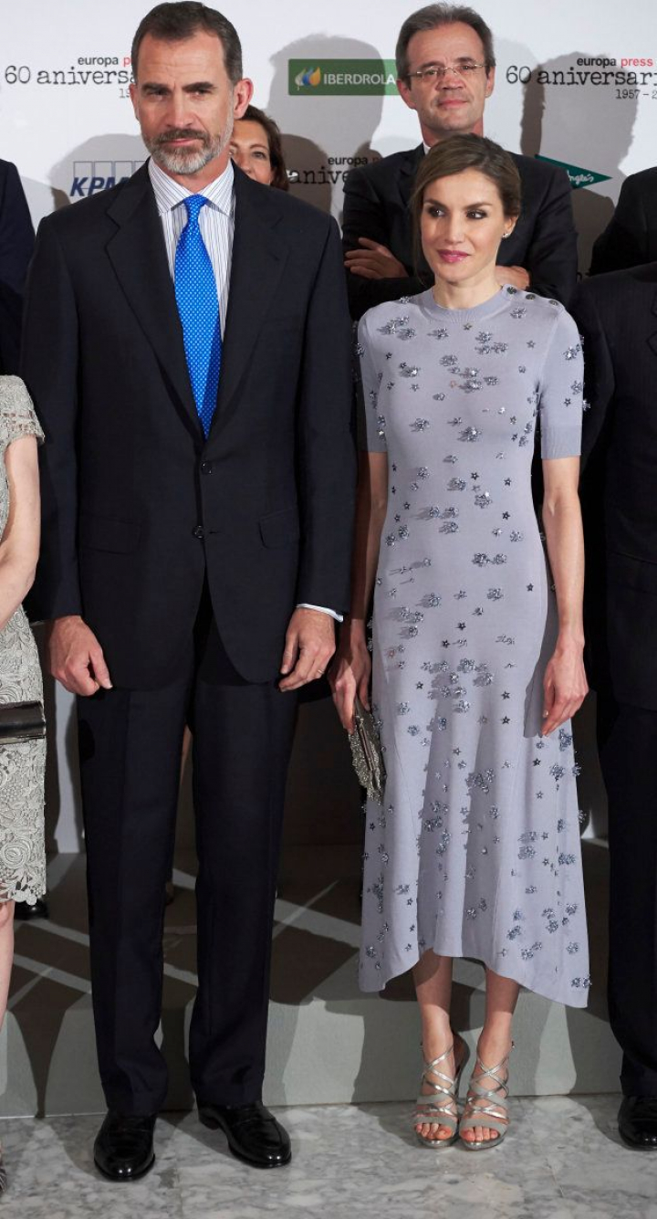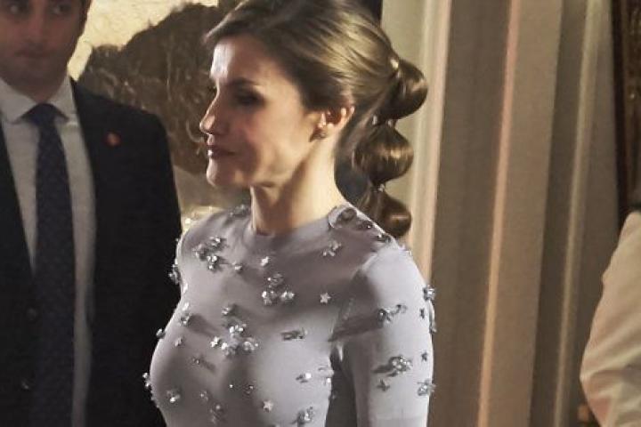 Algo que volvió a ocurrir la noche del martes 30 de mayo. Los reyes de España fueron los invitados de honor a la celebración del 60º aniversario de la agencia de noticias Europa Press. Para la ocasión, la reina estrenó vestido y peinado. Se decantó por un diseño gris perla de media manga hasta el tobillo con incrustaciones de cristal y estrellas. El vestido lo firmaba Nina Ricci, firma de origen francés pero de capital español, al pertenecer al grupo Puig. Un modelo de la próxima colección otoño-invierno con el que estaba muy favorecida.