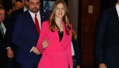 En ese momento, la reina se ha fijado en que su hija, la princesa Leonor, tenía el cabello mínimamente descolocado, por lo que se ha apresurado a mejorar su aspecto con la mano.
