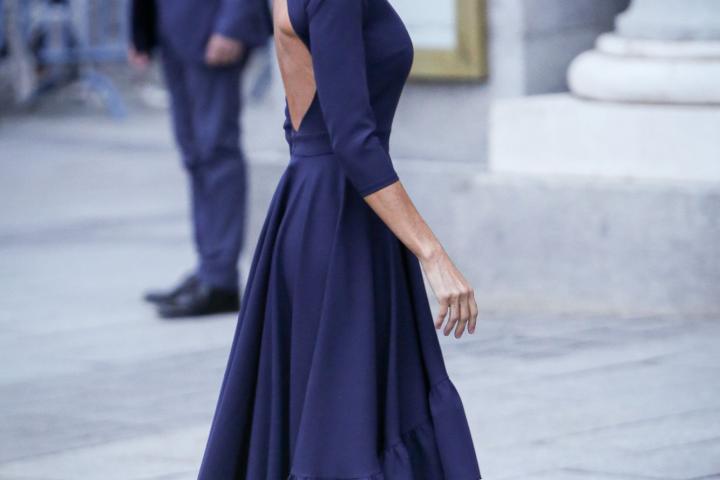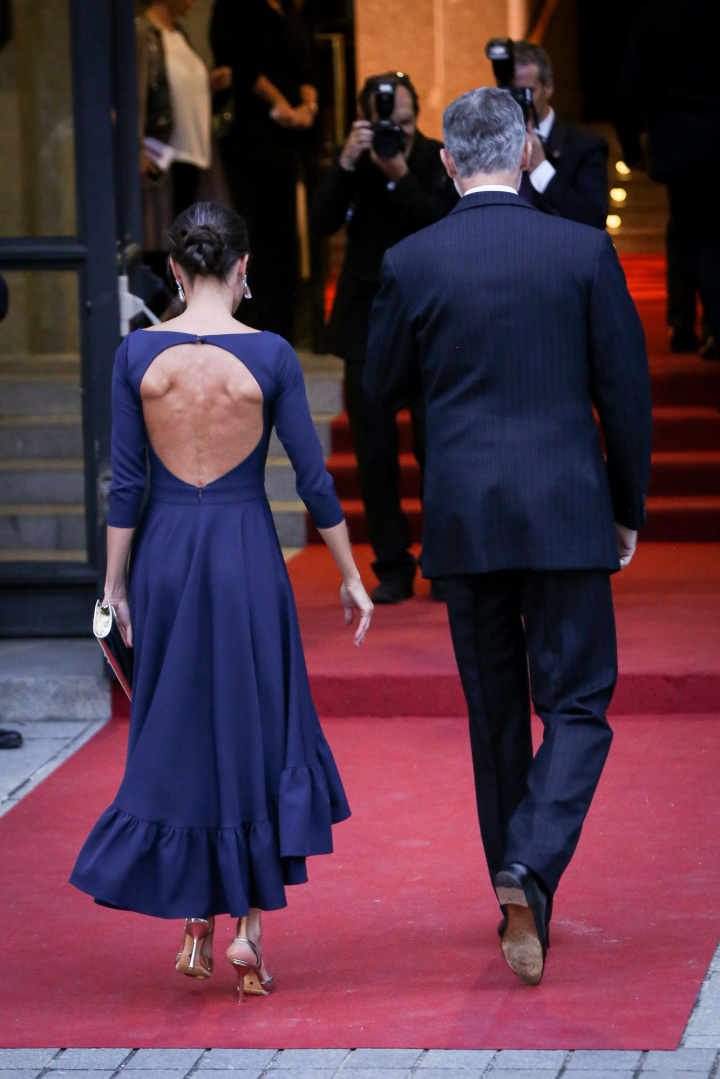 La reina Letizia impactó este lunes en la inauguración de la temporada del Teatro Real de Madrid. Para esta cita cultural suele sacar a relucir sus mejores galas y en esta ocasión optó por un vestido azul marino de Miphai que dejaba casi toda su espalda a la vista.