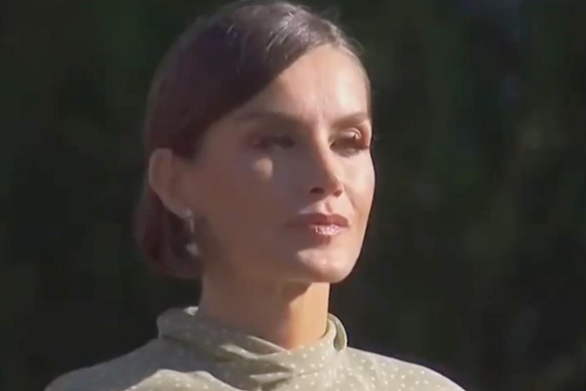 No ha sido el caso este miércoles, ya que Letizia ha apostado por un vestido midi en color verde plagado de pequeños lunares. Se trata de una prenda de la marca andaluza Vogana, confeccionada en tejido fluido, en la que destacan las grandes mangas abullonadas sembiabiertas que dan movimiento al diseño.