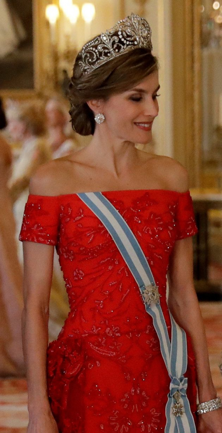 La reina Letizia, de esperado y favorecedor rojo, estrenó para esta gran noche un vestido rojo de tul y seda bordado en pedrería con escote palabra de honor y breves mangas de su modisto de cabecera, Felipe Varela (muy parecido a otro de Zuhair Murad), con la banda de la orden de Carlos III. La reina acompañó este impresionante modelo con tres complementos de la más alta joyería: la tiara Flor de Lis — la pieza más importante del joyero de los Borbones y que estrenó en un simbólico gesto en la visita del presidente de Argentina, Mauricio Macri—, los pendientes de brillantes y una de las dos pulseras gemelas de Cartier.