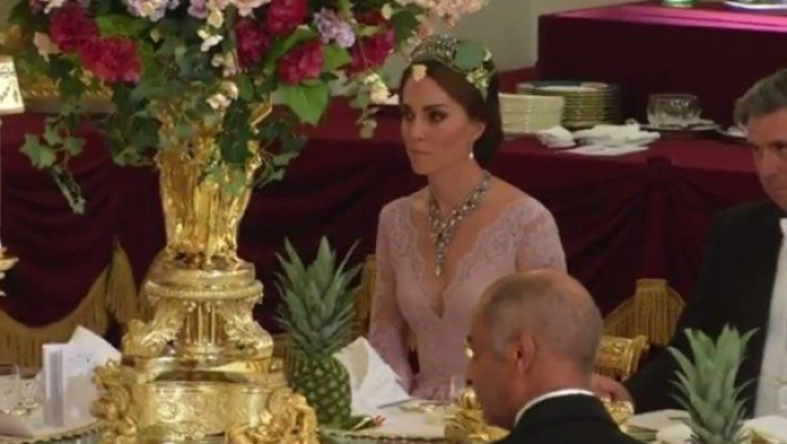 También acudió a la cena de gala Catalina, la esposa de Guillermo de Cambridge (nieto de la reina, segundo en la línea de sucesión al trono tras el príncipe Carlos de Inglaterra). Kate llevó un vestido en tono rosa empolvado con mangas de volantes y profundo escote de la firma estadounidense Marchesa, así como una tiara llamada Cambridge Lover's Knot creada en 1914 y que fue una de las favoritas de la princesa Diana, que la recibió como regalo de boda por parte de la reina Isabel II. La duquesa de Cambridge también llevó un collar perteneciente a Isabel II con diamantes y rubíes.