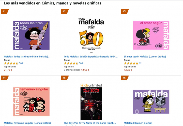 En concreto es Mafalda. Todas las tiras (Lumen), el libro recopilatorio publicado en octubre de 2011, el que arrasa en ventas. Es el más vendido de Amazon Libros. La publicación recoge los once tomos recopilatorios de viñetas de Mafalda, numerados de 0 a 10, que fueron publicados entre 1964 y 1973.