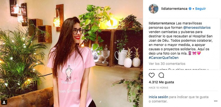 "Todos podemos colaborar, en menor o mayor medida, a apoyar causas o proyectos solidarios. Aquí os dejo una foto con la mía.👚🎀💖", escribe en la red social Torrent, con el hashtag #CancerQueTeDen.