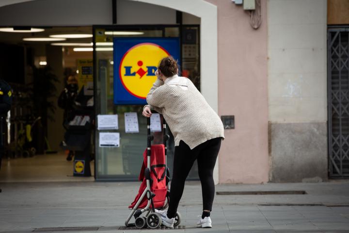 Una mujer espera para entrar en un Lidl en Barcelona en el segundo día laborable nada más decretarse el estado de alarma, el 17 de marzo de 2020.Europa Press News via Europa Press via Getty Images