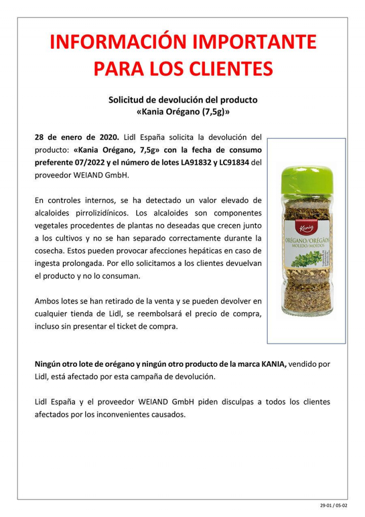 La cadena de supermercados Lidl ha emitido este viernes un comunicado alertando de uno de sus productos y solicitando su devolución. Se trata del producto Kani Orégano, 7,5 gramos.