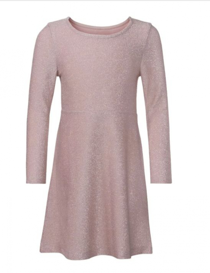 Entre los vestidos, hay un diseño para niña, que cuesta 6,99 euros, de punto con tejido brillante, manga larga y falda acampanada disponible en gris y en rosa.