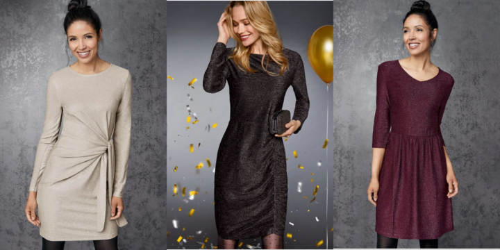 Para mujer, hay tres modelos distintos de vestidos festivos, todos a 12,99 euros. Todos estos diseños cuentan con un efecto brillante sobre el punto y manga larga, aunque se diferencian en el corte. El primero, con un lazo en el lado derecho que se oferta en color champagne, en azul y en gris; otro, con un drapeado y la falda más ceñida en negro y color champagne, y por último, un diseño con falda acampanada.