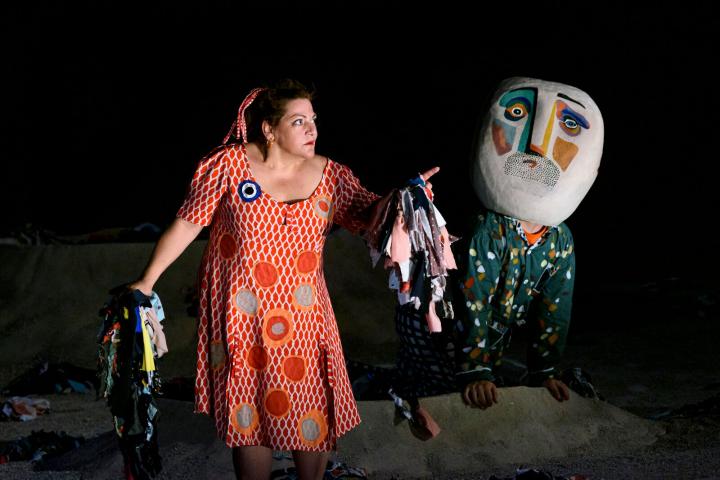 Un terreno que escenográficamente se ha representado como un lugar lleno de cráteres que irán siendo ocupados por los distintos personajes, desde la que dirán sus parlamentos, normalmente enmascarados. Y también serán ocupados por grandes cantidades de ropas usadas, dejadas en el suelo, abandonadas, una bonita y sutil metáfora de la guerra (consumista) en la que estamos. No usando la máscara del covid, sino unas máscaras teatrales muy atractivas que, a la salida, como hay que pasar al lado del escenario el público no puede evitar el acercarse a tocar aquellas que los actores dejaron en el escenario cuando salieron del mismo y dejaron de ser sus personajes. Máscaras tan bonitas como también lo es el vestuario. Contemporáneo, con color, algo boho-chic excepto para Lisístrata que en ese estilo tiene el vestido de una mama mediterránea entrada en años y en kilos y con la misma fuerza.