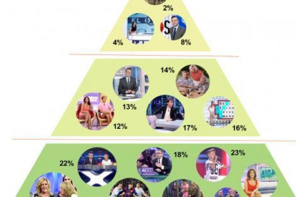 Analizando las cuotas de pantalla podemos hacernos una idea aproximada de cómo es nuestra pirámide de imágenes (y si nuestra mente está en forma o necesita rehabilitación urgente). Los contenidos que más vemos son precisamente los que pertenecen al Fast Thinking. Las peleas y los cotilleos componen nuestro principal alimento y "Sálvame" (con un 21% de share) nos lo sirve a diario con tres sabores: Naranja, Limón y Deluxe. En esta franja se encuentran también los talent shows como "Tu cara no me suena todavía" o "Got Talent", que registran las cuotas más altas llegando al 24%. Los realities tipo "Gran Hermano", que se reproducen como los gremlins, rondan el 18% de share. Los partidos de fútbol también se englobarían en este grupo (alcanzando el 21%) y algunos morning shows que ofrecen un poco de todo, como el de Ana Rosa Quintana (19%). En la zona media de nuestra pirámide estarían las series de televisión, los informativos, los concursos y los late shows como "El Hormiguero", con cuotas de entre el 12% y el 17%. Los programas menos vistos son los que requieren más atención, tocan temas sociales y políticos o profundizan. En esta línea se encuentran espacios como "El Objetivo", "La Aventura del Saber", "Informe semanal", documentales y reportajes periodísticos, que se mueven entre el 1% y el 8% de share.