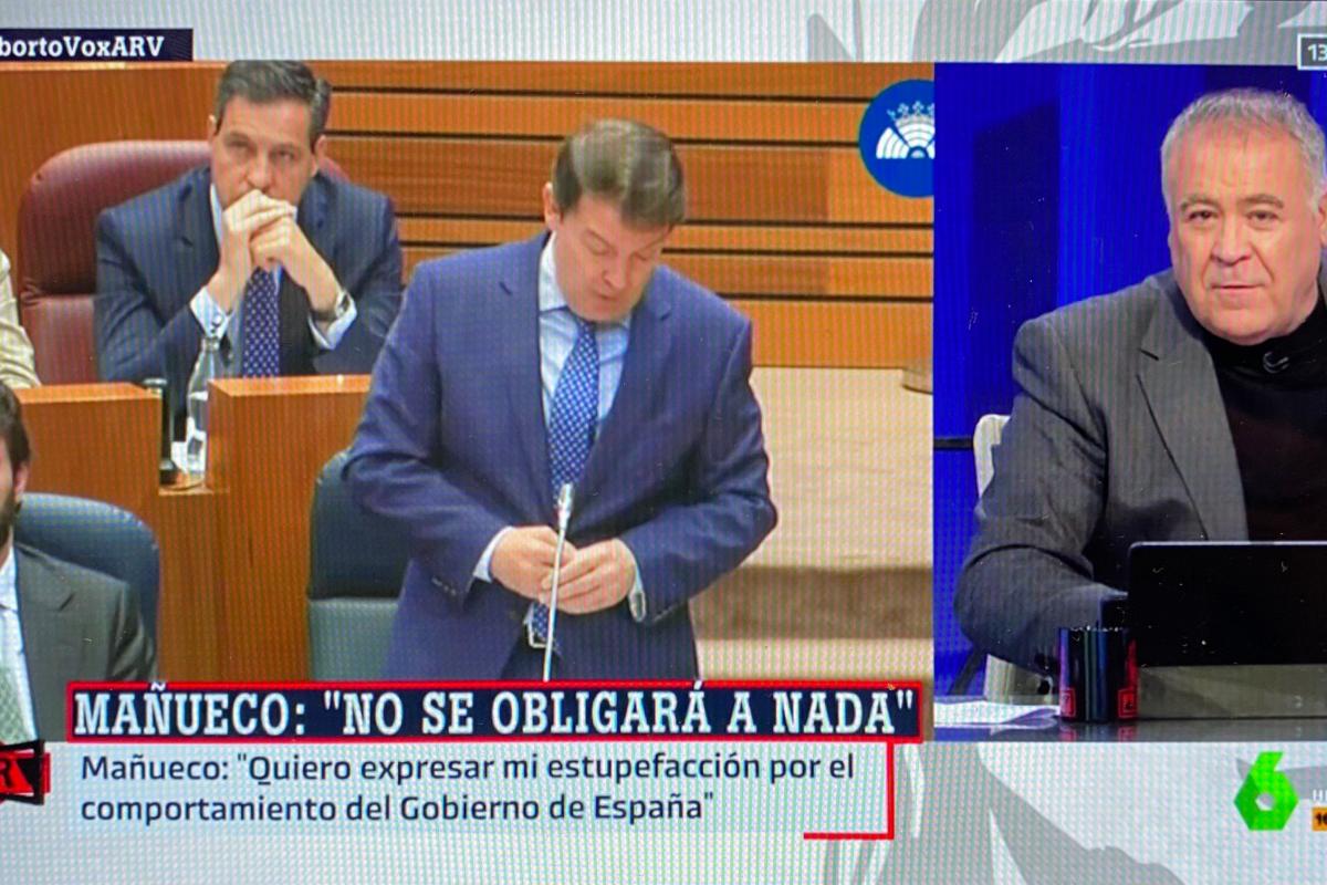 El periodista tampoco ha tardado en mencionar a García-Gallardo y, al instante, ha dicho eso: “Dice (Mañueco) que no va a ser obligatorio para la mujer, ni para los profesionales... ¿Lo ha hablado con su vicepresidente? Porque (el de Vox) esta mañana seguía siendo confuso. Y Gallardo fue el que lo anunicó en una comparecencia celebrada en la sede de la Junta de Castilla y León y junto al Partido Popular”.