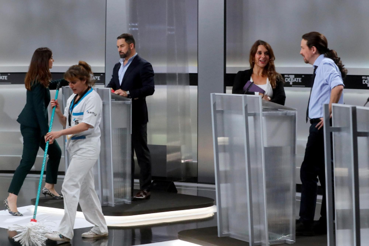 En el debate electoral del pasado mes de abril hubo una imagen que fue muy criticada en redes sociales. En un debate en el que solo había cuatro hombres, un grupo de mujeres aparecieron en pantalla para limpiar el suelo del plató.