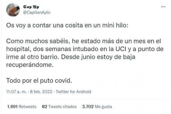 El usuario de Twitter @CapitanApio está consiguiendo abrir los ojos a mucha gente sobre la importancia de la sanidad pública española tras contar en esa red social su experiencia al infectarse con el coronavirus.