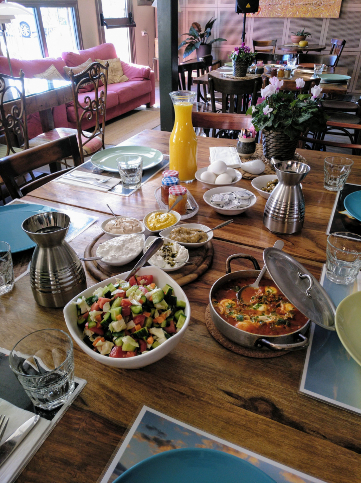“En casa la gente no tiene tiempo, pero cuando se van de vacaciones o cuando llega el fin de semana, se relajan, les apetece salir, sentarse tranquilamente y desayunar bien”, explica. “Los viernes y los sábados [fin de semana en Israel] mucha gente sale por las mañanas con sus hijos o con amigos”, cuenta Aviva, que llegó hace 13 años a Mitzpe Ramon (cerca del cráter Ramon, la joya del desierto) y fundó el hotel cuando no había prácticamente nada en la zona. “El desayuno se ha vuelto muy social, ya no tanto por la comida, sino por la idea de reunirse para algo que no supone una gran obligación ni es muy caro”.