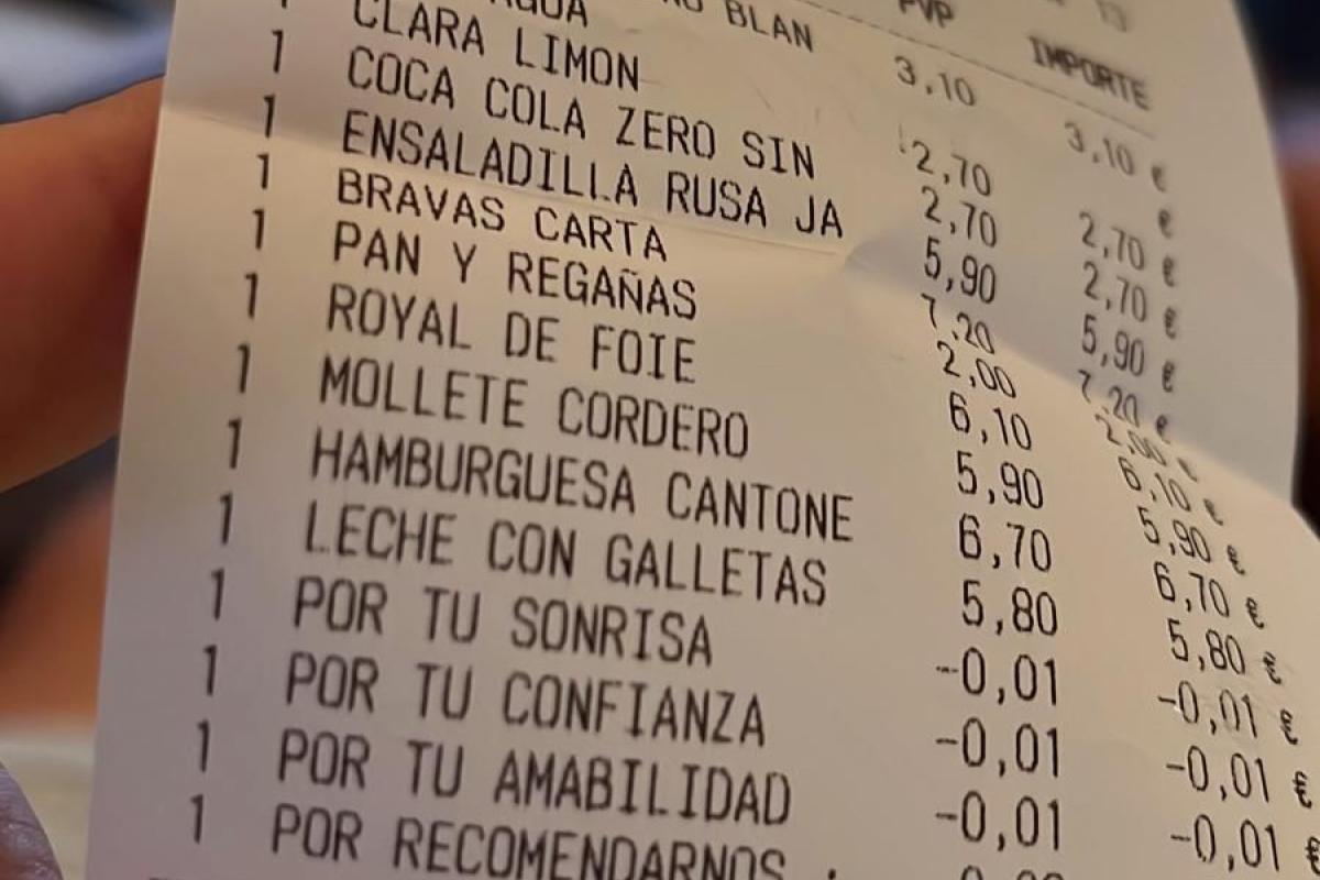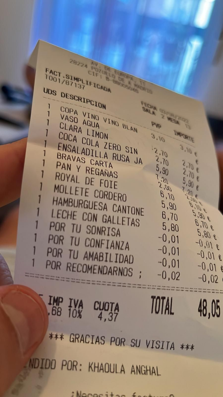 Al final se añade también otro concepto, “por recomendarnos”, por el que se descuentan dos céntimos al total de la cuenta.