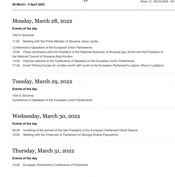 Por no aparecer, la visita de Ayuso no está recogida ni en la agenda oficial de Metsola, donde en el día 30 sólo vemos un acto en recuerdo del fallecido presidente del Parlamento Europeo David Sassoli y un encuentro con el presidente del Parlamento de Georgia.