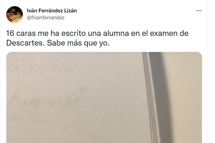 “16 caras me ha escrito una alumna en el examen de Descartes. Sabe más que yo”, ha escrito Ferrández, junto a una imagen de la última cara numerada. Además, ha detallado en otro tuit que lo hizo todo en una hora y media.