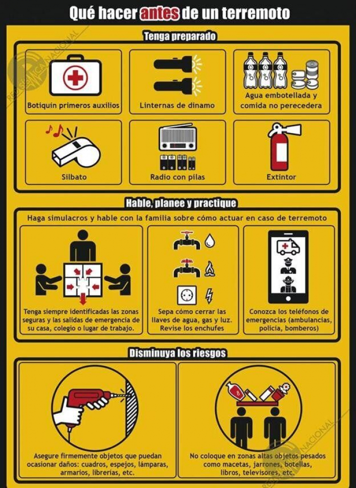 También el IGN publicó una guía visual sobre qué hacer antes de un terremoto. Si existe riesgo de temblor inminente, como es el caso ahora en Granada, recomiendan tener cerca un botiquín de primeros auxilios, un silbato, linternas, agua embotellada, así como es conveniente asegurar aquellas partes que corran peligro de caída. Por supuesto, nada de poner objetos pesados en baldas altas.