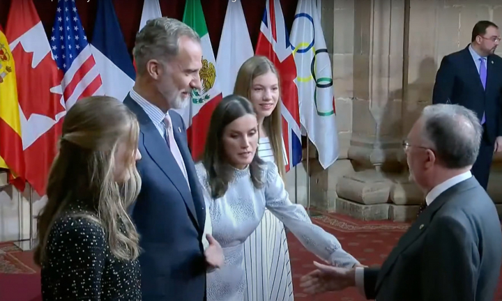 Después ha sido el rey el que ha indicado a los premiados que debían saludar primero a Leonor porque era la primera en la línea del besamanos. De hecho, como se puede ver en el vídeo que ha compartido Casa Real, los invitados posteriores ya sí han saludado primero la heredera al trono.