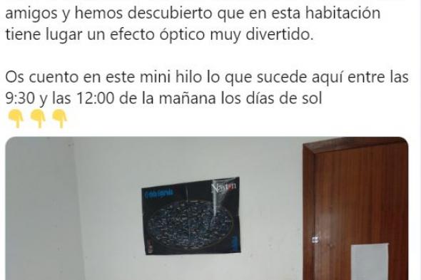 En el cuarto en cuestión se produce un curioso efecto óptico entre las 09:30 y las 12:00 de la mañana, cuando hace sol, que se ha dedicado a explicar en una serie de tuits.