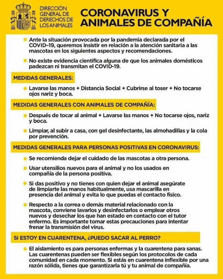 Tampoco la vuelta a casa. La limpieza y la higiene deben ser primordiales, también con nuestras mascotas. Por el momento, no se ha demostrado que los animales de compañía puedan ser contagiados por el covid-19, pero sí que pueden traer la bacteria tras un paseo. Un perro se lame las patas, posteriormente te lame a ti, y también es objeto de caricias por toda la familia.
