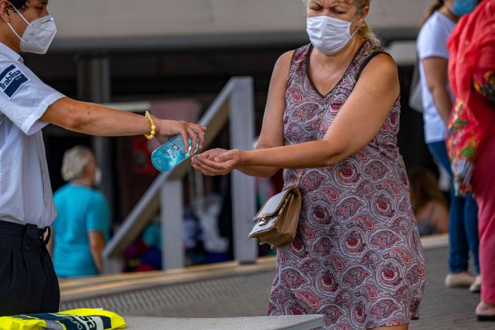 Una mujer recibe el gel desinfectante.Getty Images