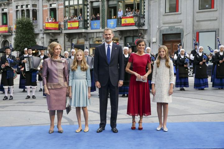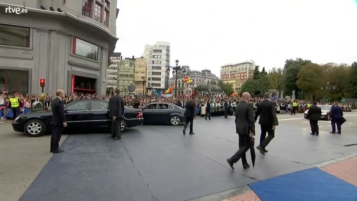 Más todavía este año, cuando la princesa Leonor se estrena y lee su primer discurso en público. Así que las calles de Oviedo estaban engalanadas y, a las puertas del Teatro Campoamor, decenas de personas daban la bienvenida a los reyes.