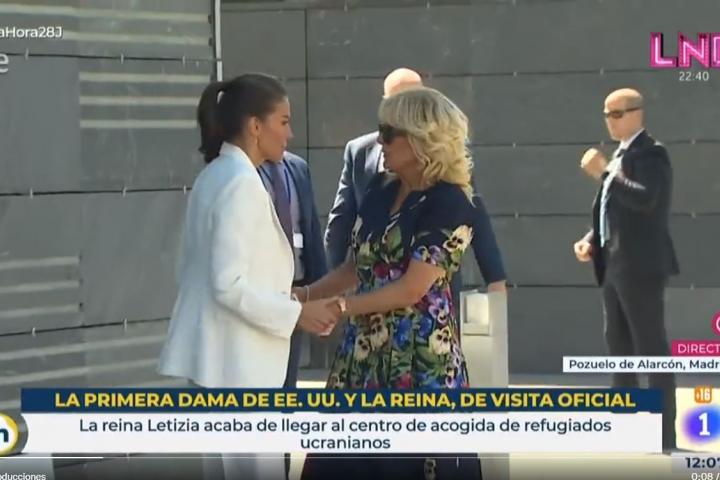 La reina Letizia ha sorprendido este martes a los periodistas de TVE al recibir con dos besos a la primera dama de Estados Unidos, Jill Biden.