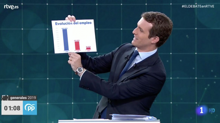 El candidato popular iba preparado: con frases como “cuando entra el PSOE por la puerta, el empleo sale por la ventana,”, y con gráficos, muchos gráficos. Los expuso como si fuera el alumno más aplicado de la clase y evitó la confrontación con el resto de candidatos.