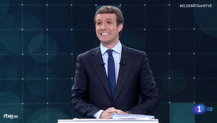 Casado dejó el lenguaje agresivo de la campaña electoral fuera del plató y se enzarzó poco. Los planos generales hablaban por si solos: el resto de candidatos debatiendo, gesticulando, negando o asintiendo, y Pablo Casado en una esquina sonriendo.