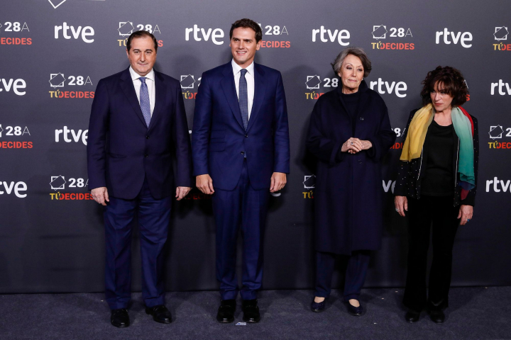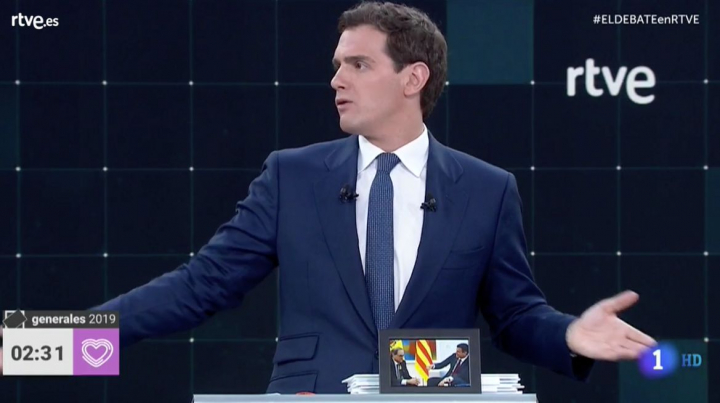 Rivera también llevaba papeles. Y fotografías. El candidato de ciudadanos pasó buena parte del debate con una foto de Sánchez y Torra en su atril, mientras gesticulaba incesantemente ante cada alusión de sus contrincantes. Terminaba más eufórico que nervioso Rivera, que se ha enfrentado con todos y le ha comido el terreno a Pablo Casado, con una hiperbólica intervención con una oda al silencio.