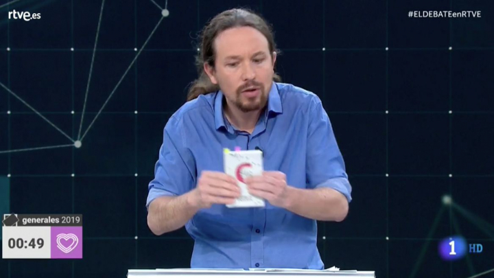 El gran complemento de Iglesias no fue su clásica coleta, fue la constitución. El candidato morado se la sacó del bolsillo y leyó unos cuantos artículos reclamando a sus compañeros de debate el cumplimiento de varios artículos. Se mantuvo fiel a su estilo incisivo y se movió con naturalidad.