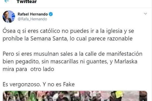 ″Ósea que si eres católico no puedes ir a la iglesia y se prohíbe la Semana Santa, lo cual parece razonable Pero si eres musulmán sales a la calle de manifestación bien pegadito, sin mascarillas ni guantes, y Marlaska mira para otro lado Es vergonzoso. Y no es Fake”, ha escrito el senador junto a la foto.