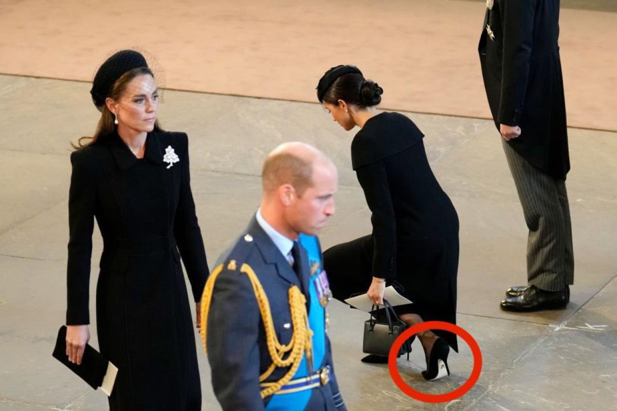 Y, ahora, un detalle en la suela de sus zapatos está dando lugar a todo tipo de teorías (locas). Cuando Markle se acercó al ataúd de Isabel II e hizo una profunda reverencia, se pudo ver un símbolo bajo sus tacones.