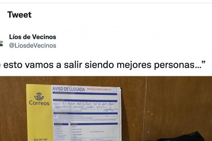 Pocas cosas gustan más en Twitter que los líos entre vecinos. De hecho, la cuenta @liosdeVecinos tiene más de 50.000 seguidores gracias a publicar contenido relacionado con peleas entre ciudadanos que viven en el mismo edificio.