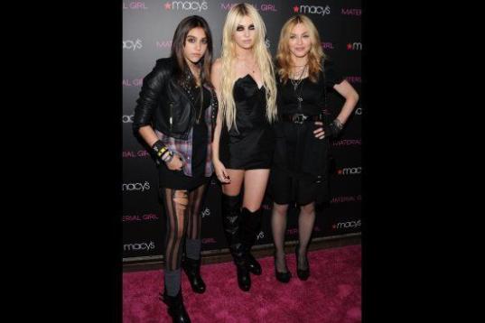 Madonna junto a la modelo Taylor Momsen y su hija Lourdes en el lanzamiento de la colección Material Girl de los grandes almacenes Macy, septiembre de 2010