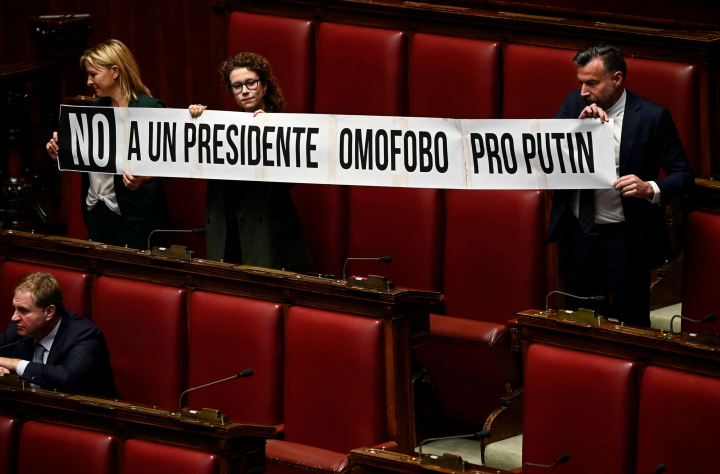 La izquierda ha movido en vano su propia candidatura, a sabiendas de que no tenía opciones frente a Fontana. Durante la sesión, varios diputados del Partido Democrático han exhibido una pancarta contra él: “No a un presidente homófobo pro Putin”.