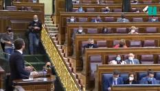 De esta escena también es reseñable la cara de Abascal al escuchar Sánchez. Sonríe y se gira al lado en el que está Iván Espinosa de los Monteros, que no se inmuta.