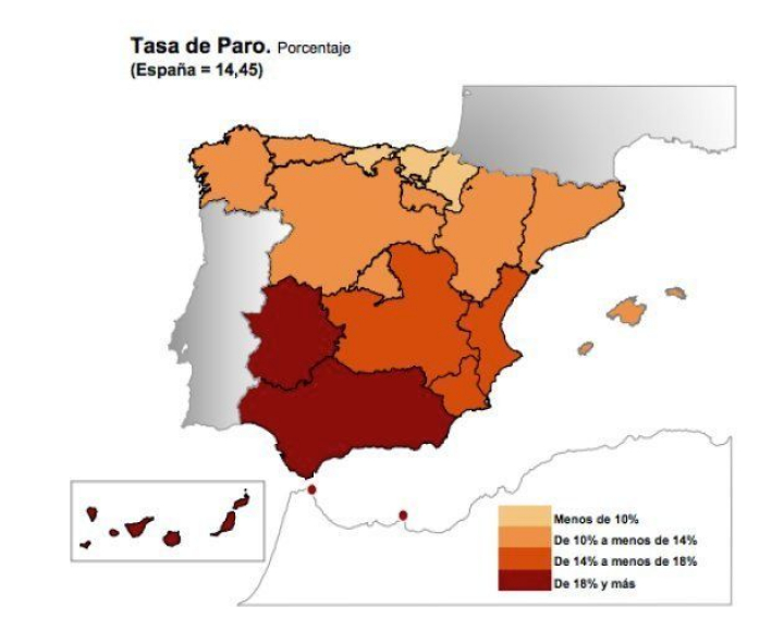 Las comunidades autónomas del sur de España son las que tienen peores cifras de empleo. La región con más paro del país es Extremadura, con una tasa de paro del 23,1%. Le siguen Andalucía, con un 21,26%, e Islas Canarias, con un 19,99%.